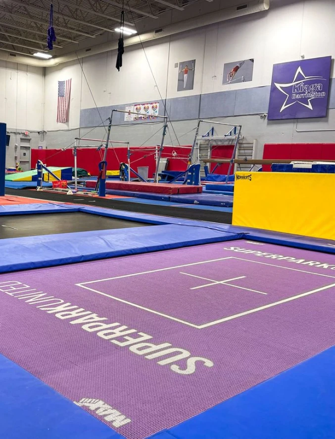- A spacious training floor equipped with beams, bars, trampolines, tumbling areas, vaulting equipment, and preschool apparatuses